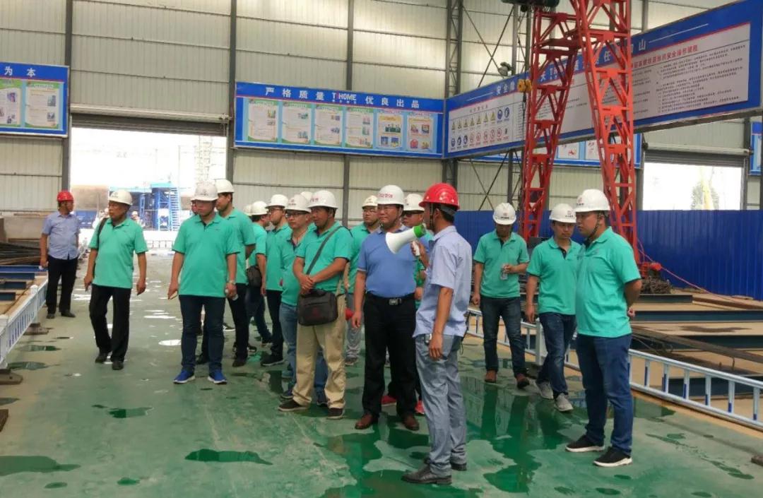 觀摩隊伍觀摩了橋梁預制廠生產車間,作為河南省首個采用預制T構懸臂粱拼裝的項目,施工難度大,技術要求高,技術人員詳細講解了材料加工成型和制作及T構懸臂粱拼裝現場制作工藝和質量管控要點。通過講解,使大家對橋梁施工新型工藝技術有了更深刻的理解,更加感受到技術創新在施工中的重要性。