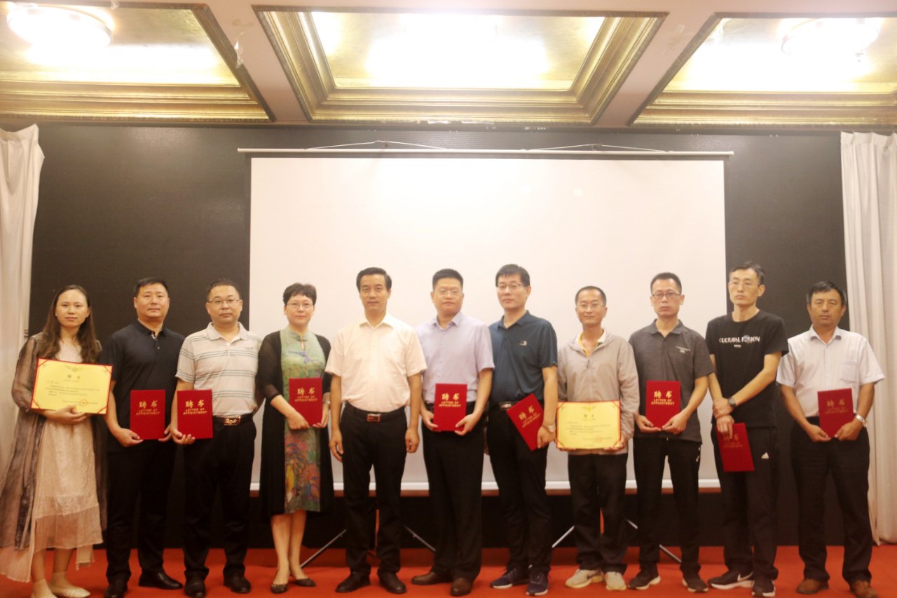 楊明宇理事長為鶴壁技術研究院副院長張紅偉、谷春偉、臧素青、樊振宏、羅春明、 王英智、王建嶺、唐希明、王德峰,秘書長代霞頒發任命書