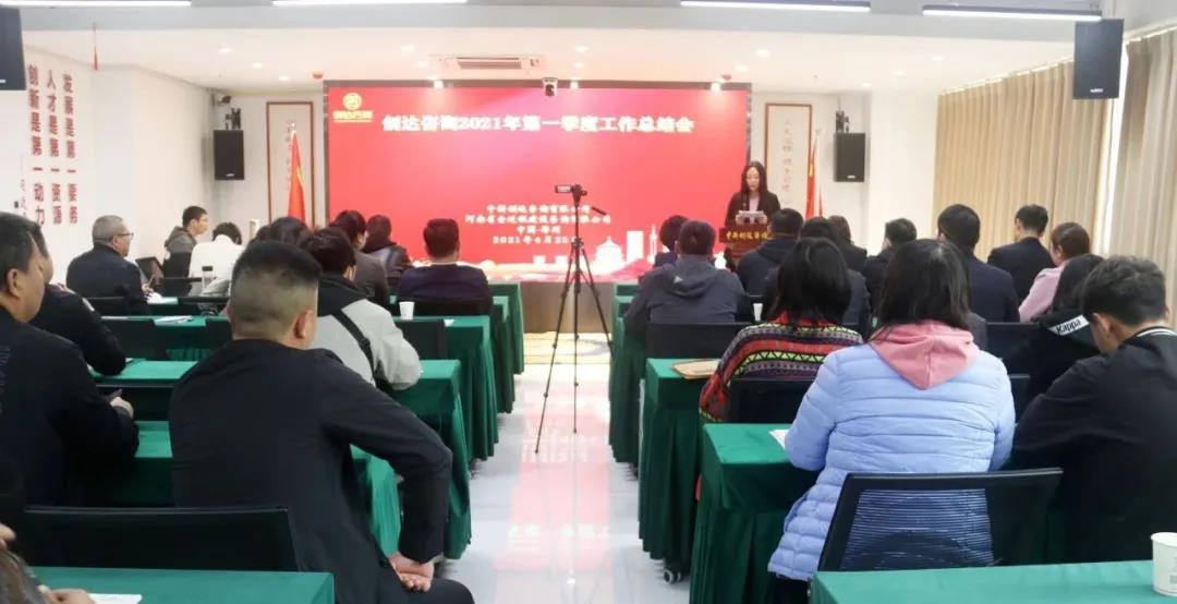 2021年4月25日上午,創達咨詢2021年第一季度工作總結會在鄭州總部召開,會議采用現場+視頻直播形式,在全國設置分會場。公司董事長楊明宇,執行董事徐希萍,副總裁葛群、丁東,各中心負責人及全國各地分公司、事業部、項目部代表參加會議。會議由市場開發中心常務副總路俠主持。